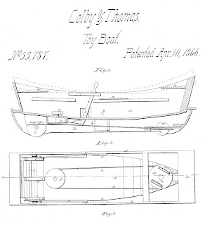 Levi Thomas and a partner patented a “toy boat” in 1876 (US53787). The “boat” was a child’s riding toy. The boat was mounted in a base painted to look like water, and rocked when propelled, to mimic the movement of a boat on water. It could be propelled by a set of “oars” attached to a ratchet-and-pawl mechanism that moved a set of wheels.